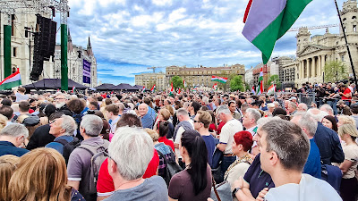 Nem sorolom tovább a felszólalásokat. Volt együtt éneklés (Tolcsvay: Nemzeti dal, majd LGT: Miénk itt a tér - Nagy Ervin a capella vezényletével), a Polip című olasz maffiasorozatot idéző videó és annak zenei megidézése, de a fő attrakciót természetesen Magyar Péter felszólalása jelentette. Ekkor már két órája álldogálltunk egy helyben, szűk, levegőtlen tömegben, hátamon a 5-8 kg-os fotós hátizsákkal, s éreztem, hogy még tíz perc és elhagy az erőm, összecsuklom, mint a rongy. Kénytelen-kelletlen kimenekültünk a tömegből (a fiam nyilván bírta volna még), s a tér szélén beszuszakoltam maga két padkán ülő ember közé.